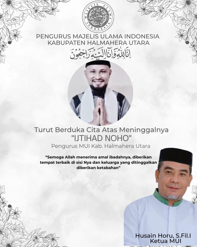 Halmahera Utara, 28/10/2025- MUI Maluku Utara turut berdukacita atas wafatnya salah satu pengurus MUI Kab. Halmahera Utara, IJtihad Noho, Lc.