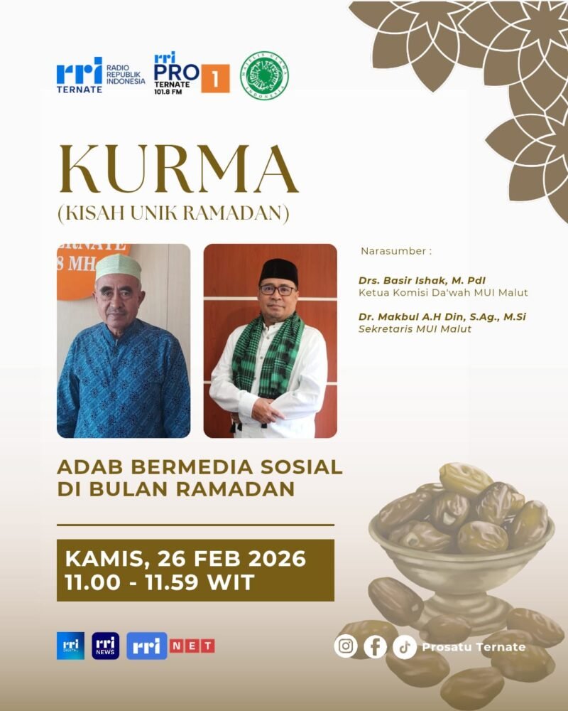 Ternate, 27 Februari 2026 – Pro 1 RRI Ternate sukses menggelar acara “Kurma (Kajian Unik Ramadhan)” pada Kamis, 26 Februari 2026, dengan mengangkat tema “Adab Bermedia Sosial di Bulan Ramadhan”. Acara yang disiarkan langsung dari pukul 11.00 hingga 11.45 WIT ini menghadirkan dua narasumber kompeten di bidangnya.