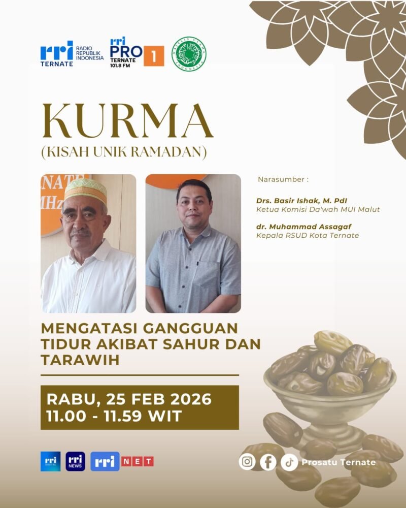 Ternate, 25 Februari 2026 – Pro 1 RRI Ternate kembali menghadirkan program spesial Ramadhan melalui acara Kurma (Kajian Unik Ramadhan) dengan tema “Mengatasi Gangguan Tidur Akibat Sahur dan Tarawih”. Acara telah berlangsung pada hari Rabu, 25 Februari 2026, pukul 11.00 sampai 11.45 WIT.