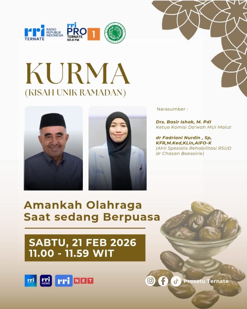 Ternate – Radio Republik Indonesia (RRI) Cabang Ternate menggelar acara “Kurma” (Kisah Unik Ramadhan) pada hari Sabtu, 21 Februari 2026, pukul 11.00-11.45 WIT. Acara yang disiarkan langsung di Pro1 RRI Ternate ini membahas tentang hikmah dan keamanan berolahraga saat sedang berpuasa.
