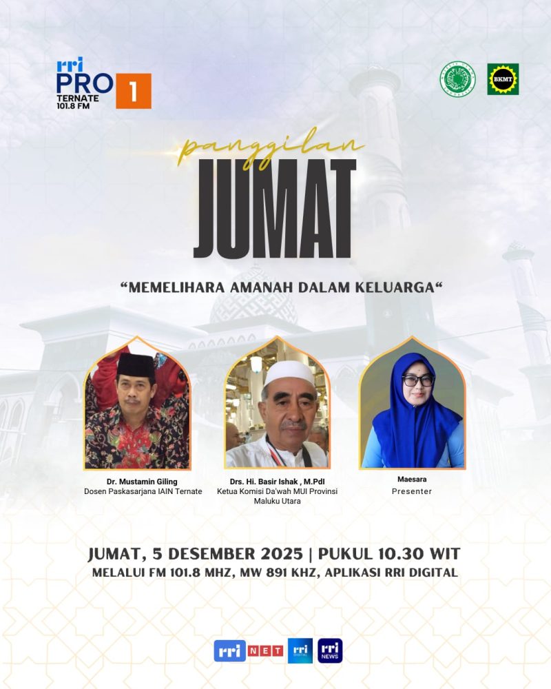 Ternate, 4 Desember 2025 – Acara “Panggilan Jumat” akan dilaksanakan pada Jumat, 5 Desember 2025 di  RRI Ternate, sebagai hasil kerjasama antara Majelis Ulama Indonesia (MUI) Maluku Utara, BKMT Maluku Utara, dengan RRI Cabang Ternate.